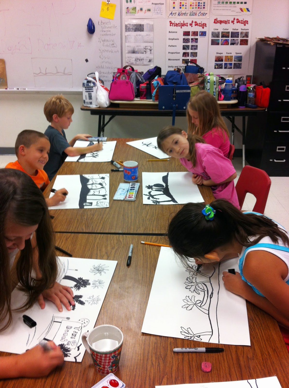This summer I decided to do a beach themed art camp. It was a blast hanging out with these 26 kiddos and 5 helpers! We had so much fun creating these mixed media beach silhouettes. We started out the artwork by drawing out our beach scenes.